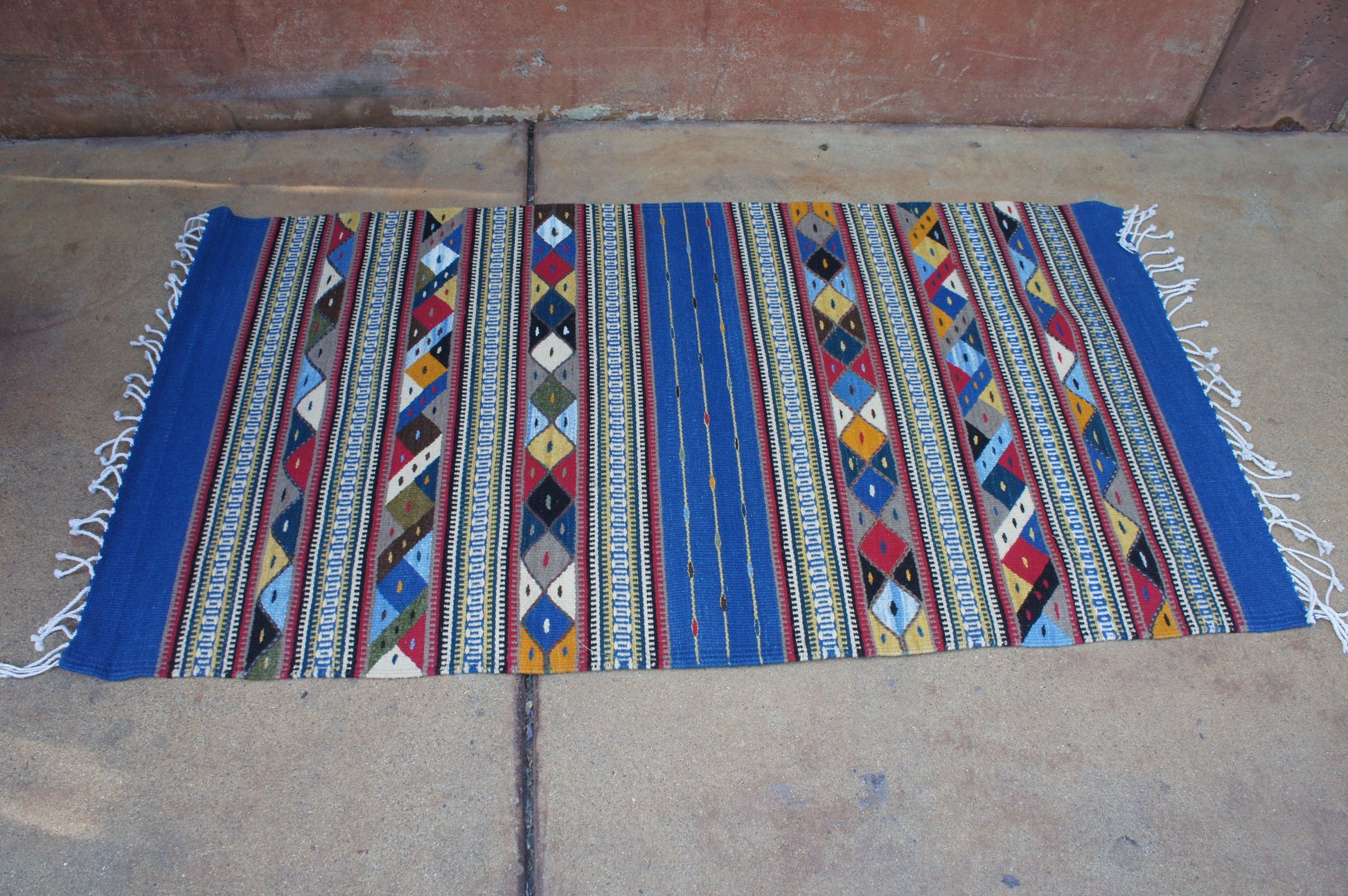 This Zapotec wool rug (31in x 59in) is a masterpiece of tradition and craftsmanship, woven by skilled artisans on a traditional pedal loom. Each line and diamond motif carries generations of cultural symbolism, while the vibrant blues, reds, and golds are dyed with organic pigments such as indigo, cochineal, marigold, and pomegranate.