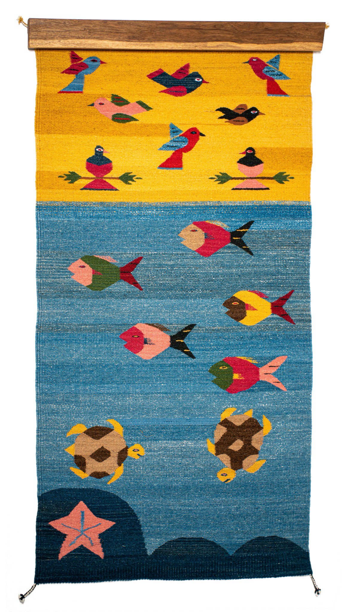 Inspired by the intricate, mind-bending artistry of Escher, this stunning tapestry captures the harmony of nature, where birds and sea creatures coexist in a vibrant dance. Handwoven on a traditional pedal loom, this piece is crafted using organic pigments, bringing to life the rich colors of Oaxaca’s natural landscape. Each animal symbolically represents the interconnectedness of life, making this tapestry a meaningful addition to any space.